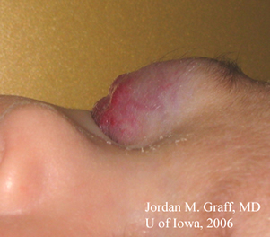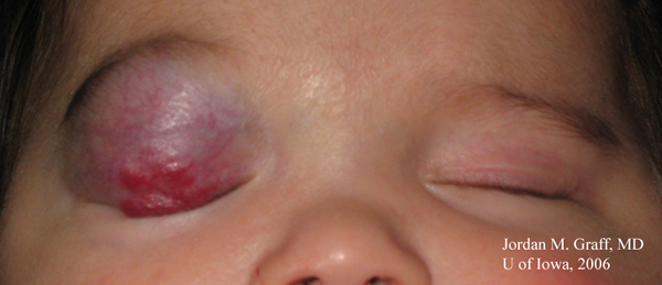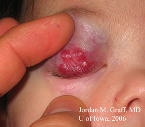 Історія хвороби: в межах тижня від пологів мама помітила зону, що стискається, на правій повіці дитини, схожу на полуницю. Зона збільшилась у розмірах за останні три місяці. В зону ураження було зроблено ін’єкцію стероїдів, що не принесла жодного результату. Пізніше було застосовано топічну та системну стероїдну терапію. При прийманні преднізолону орально, дина ставала дратівливішою, а зменшення розміру ураження не спостерігалось. Тому прийом преднізолону орально був відмінений. Тому був залишений лише стероїдний крем і дитину відправили до відділення офтальмології в University of Iowa для подальшого аналізу та ведення. Протягом всього часу лікар призначав часткову оклюзію лівого ока по 4 години на день.