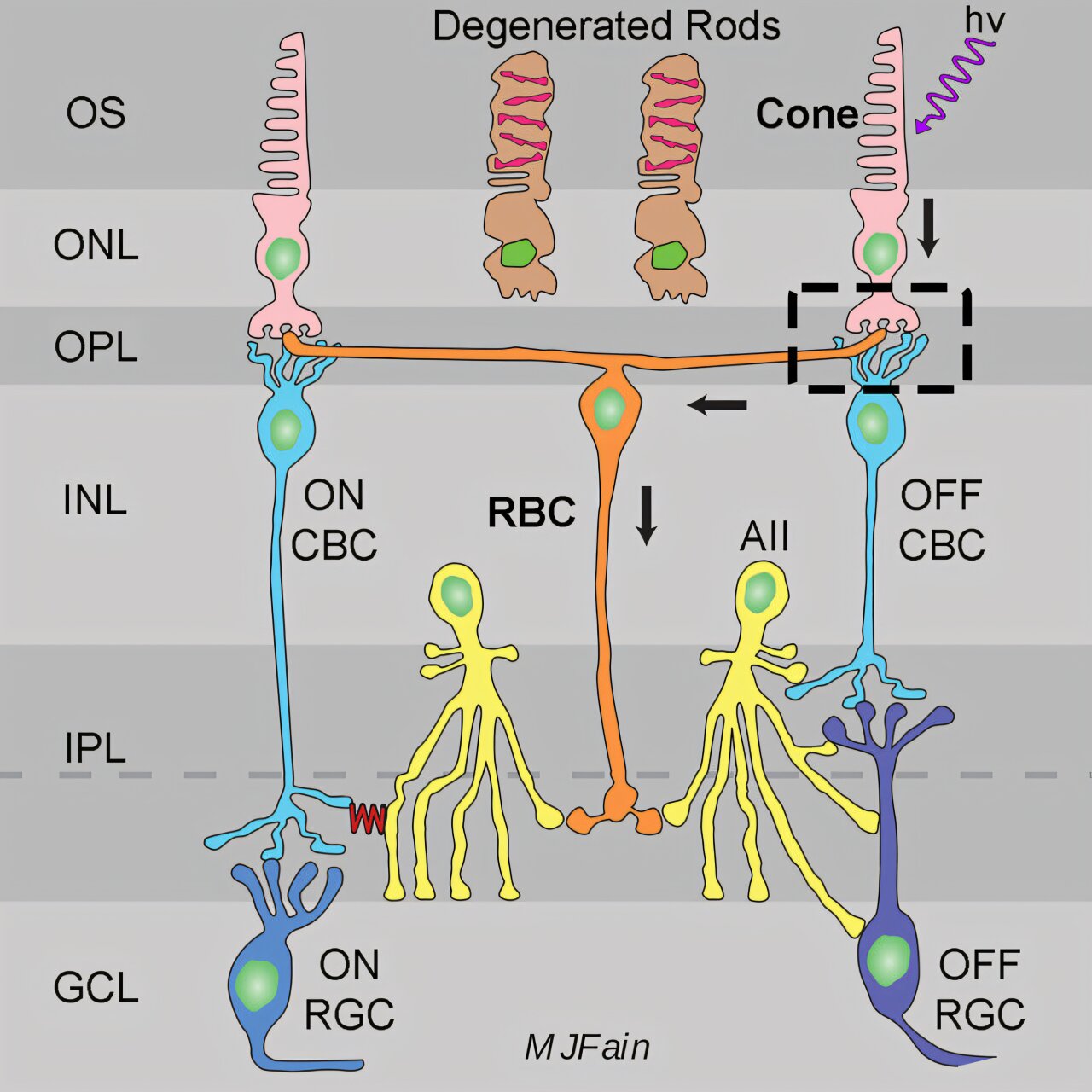 У дослідженні, проведеному на мишачих моделях, науковці встановили, що паличкоподібні біполярні клітини — нейрони, які зазвичай отримують сигнали від паличок (фоторецепторів, відповідальних за нічний зір), — здатні формувати нові функціональні зв’язки з колбочками, що відповідають за денний і кольоровий зір. Це відбувається тоді, коли палички втрачають здатність до функціонування. Результати опубліковані в журналі Current Biology.