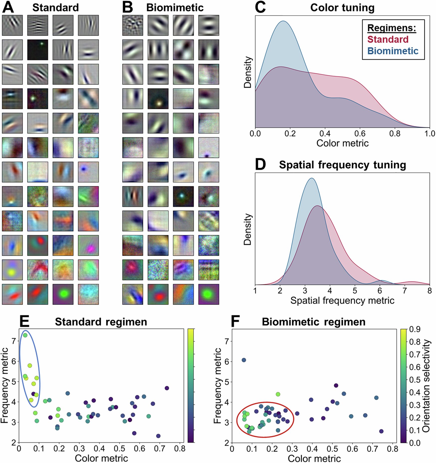 У ході аналізу дослідники помітили, що моделі, навчені на «біоміметичних» (наближених до реальних дитячих) зображеннях, розвинули дві окремі групи одиниць: